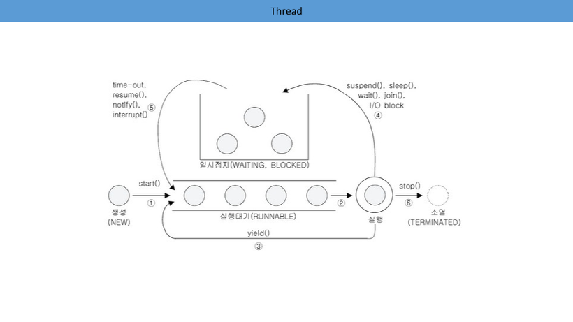 스레드는 사용자에게 한 번에 여러가지 일을 처리하는 것 처럼 보이게 만들지만 실제로는 아주 빠른 속도로 스레드를 오가며 작업을 처리하는 것에 불과합니다. CPU는 한 번에 한 가지의 작업만 처리할 수 있기 때문입니다. 그래서 기본적으로 생성된 스레드는 위 그림과 같은 생명주기를 가지게 됩니다.