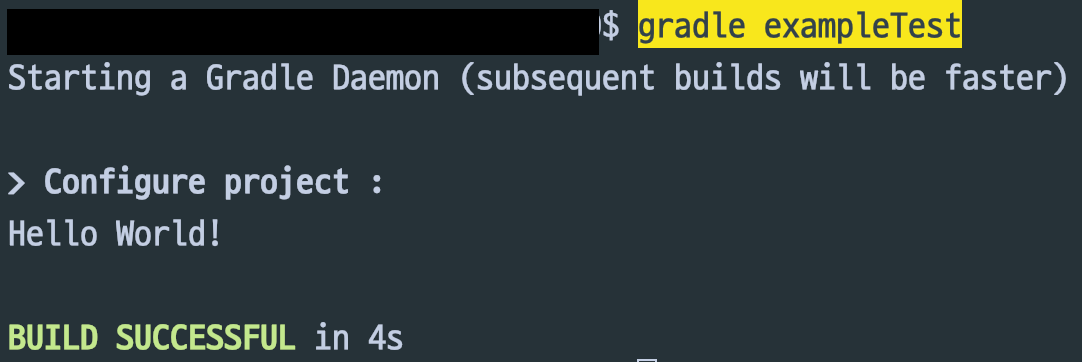 task 는 위 예시처럼 선언할 수 있으며 커맨들 라인에서 task [task 이름]으로 사용할 수 있습니다. 예시를 실행하면 다음과 같은 결과를 볼 수 있습니다.